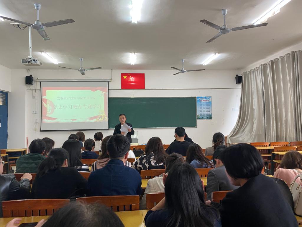 展党史学习教育专题学习,会议由党总支书记胡蓉主持,副书记王玮、护理学院院长周俊杰、副院长李学坤及全体党员教师参会。
