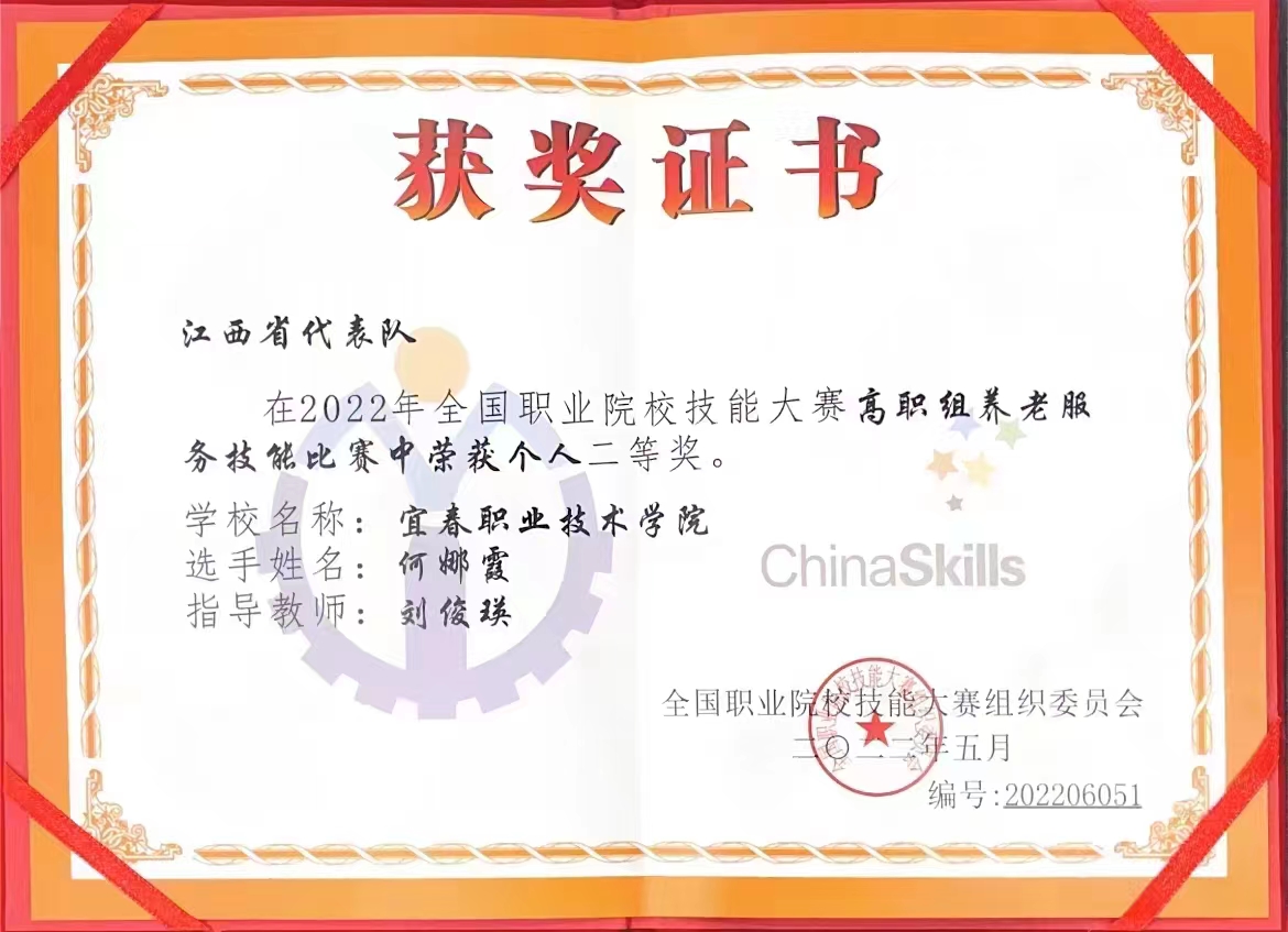 8月18日至21日,2022年全国职业院校技能大赛高职组“养老服务技能”赛项在潍坊护理职业学院举行。经过激烈的角逐,买球官网智慧健康养老服务与管理专业何娜霞同学以扎实的专业功底与良好的职业素养,从众多参赛选手中脱颖而出,夺得了总排名第七、国赛二等奖的殊荣,创造了江西省在此赛项中的最好成绩,为江西省和学校争得荣誉。指导老师为刘俊瑛、梁芳、杨艳霞和吴小华。