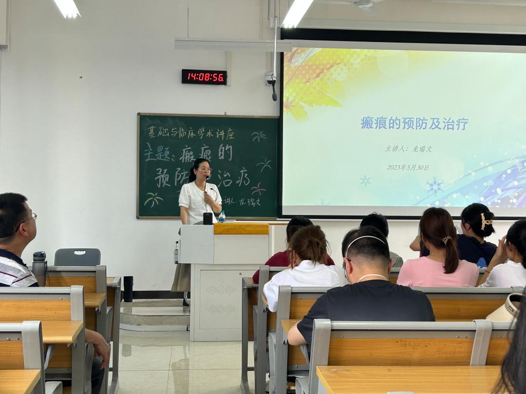 为深化党建品牌建设,拓宽学生临床视野,丰富同学们第二课堂学习活动,5月30日下午,由医学基础部主办、医者初心人文社协办的“基础与临床专题讲座——瘢痕的预防和治疗”在和济楼C419教室举行。本次讲座由医学基础部形态教研室龙瑞文老师主讲,医学基础部教师和医学院、护理学院在校学生约110人参加,讲座由医学基础部副主任邓小珍主持。