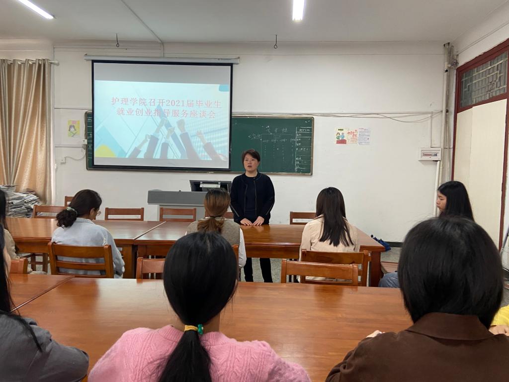楼410教室召开2021届毕业生就业创业指导服务座谈会。党总支书记胡蓉、副书记王玮、学工科科长曲晴