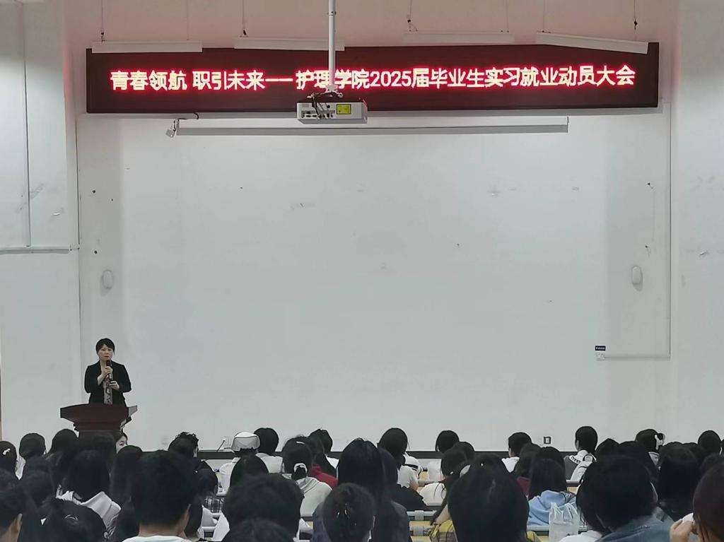 为正确引导护理学院学生做好实习和就业工作,切实提高人才培养质量和就业率,4月2日中午,护理学院在和济楼小礼堂召开2025届毕业生实习就业动员大会。院党总支书记胡蓉、副院长易国萍、党总支副书记曲晴、实习就业科曹云老师、学工科胡祖昌老师出席会议。会议由胡蓉主持。