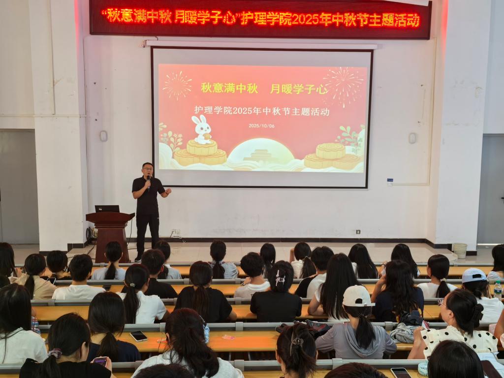 为传递中秋佳节的温暖关怀,让留校同学在校园中感受浓浓的团圆氛围,10 月 6 日下午,护理学院在和济楼阶梯教室开展“秋意满中秋,月暖学子心”中秋主题活动,党总支书记吴少林、副书记曲晴、辅导员陈丽红与留校学子共赴一场充满温情的节日之约。
