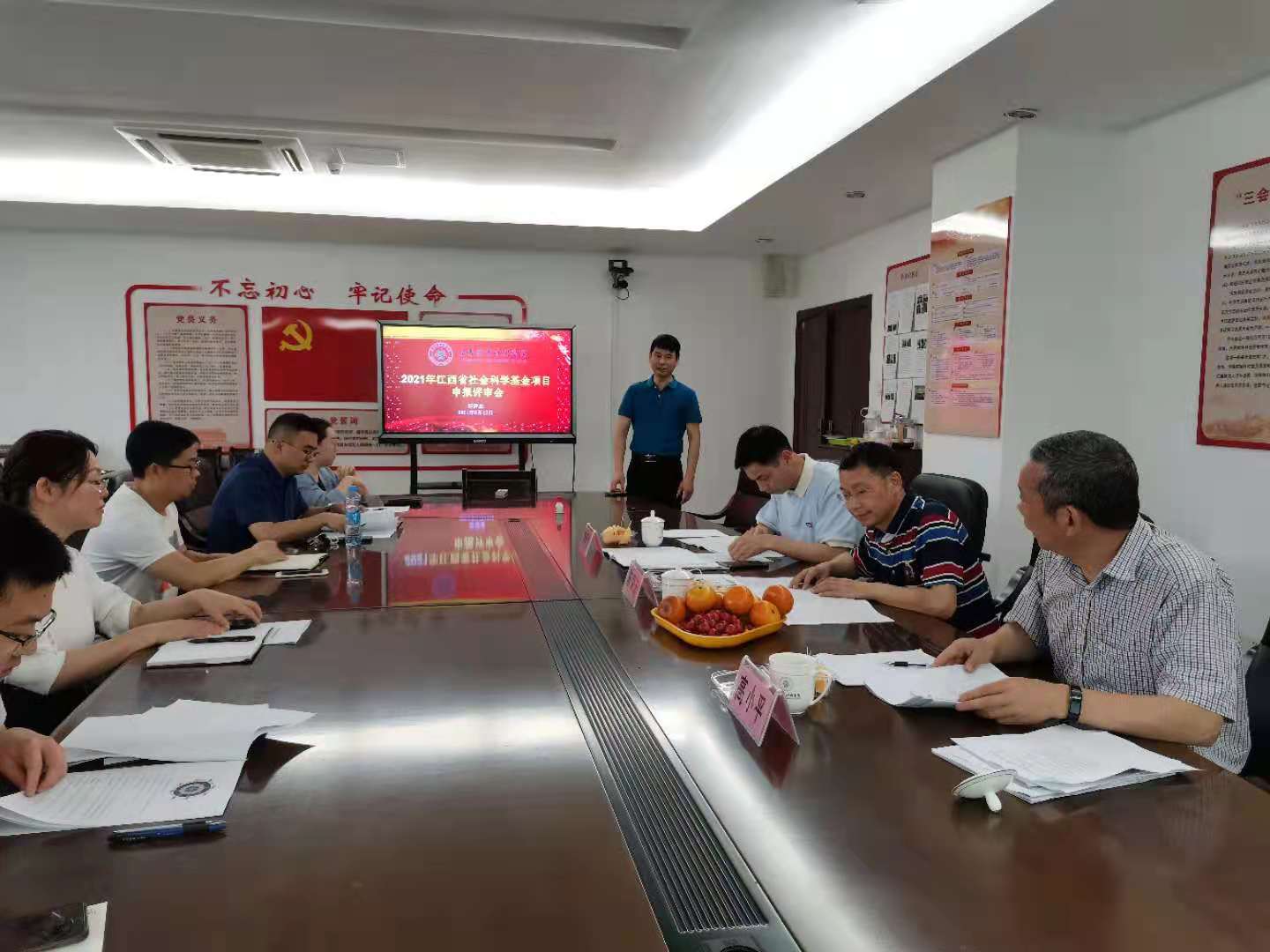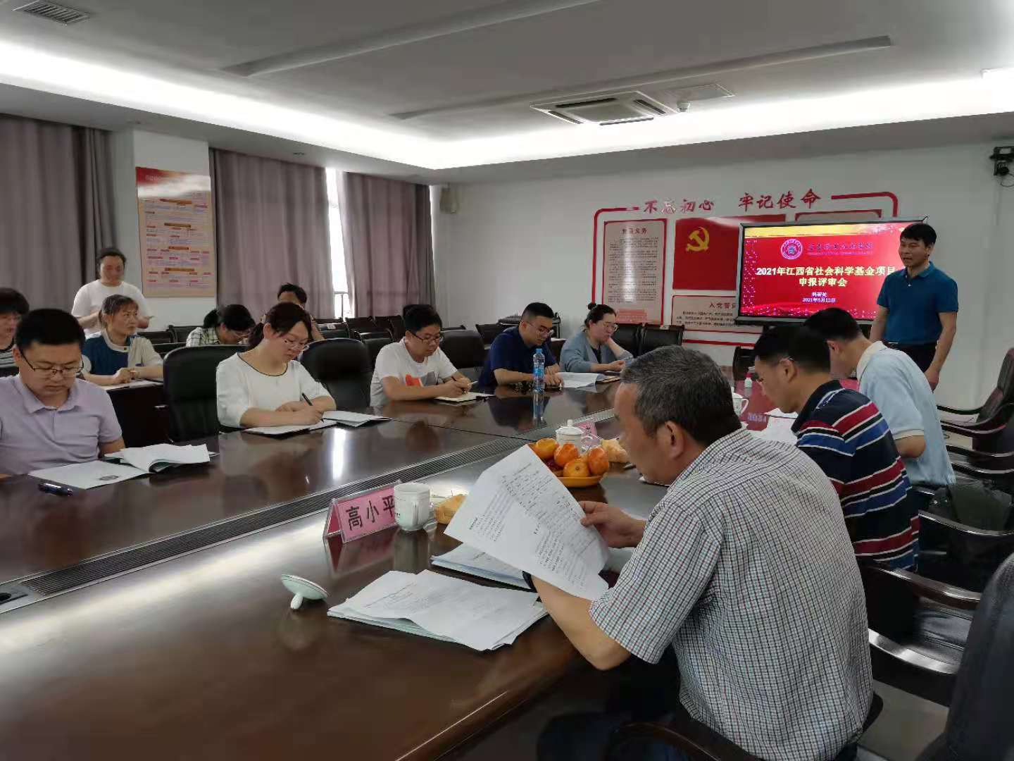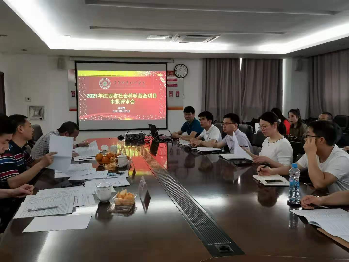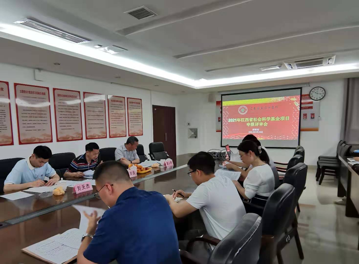 本站讯(科研处 陈艳辉)为提高课题申报质量,5月12日上午,科研处在科技综合楼413会议室组织召开2021年江西省社会科学基金项目申报评审会,由宜春市社会科学界联合会主席高小平、宜春学院科研处处长陈荣庆、宜春学院政法学院院长刘天杰担任评委,由科研处处长熊杰平主持,9个项目组共30余人参加了聆听。