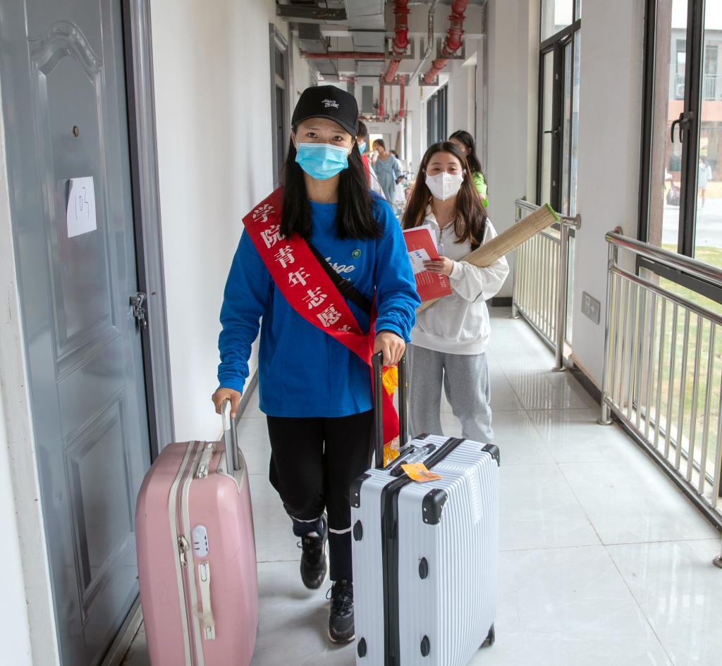 进校门时,为做好疫情监测、排查、预警等工作,工作人员们为同学们测量体温、并提醒大家出示健康码、给行李消毒、为新生和家长解惑答疑。各学院领导、辅导员带领迎新志愿者积极为新生做好服务工作,各岗位迎新工作人员密切配合,迎新现场秩序井然,各环节衔接紧凑,为新生们提供了人性化、便捷化的周到服务。