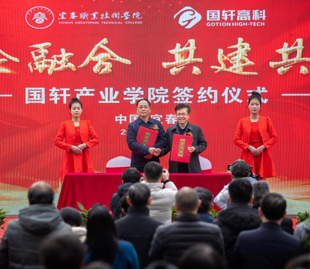 紧接着,黄章喜董事长、杨云山校长就国轩产业学院合作协议进行签约。随后,市委常委、组织部部长徐云涌,市政府副市长兰亚青,市经开区党工委副书记、管委会主任何敏,国轩高科董事会秘书潘旺和江西国轩新能源科技有限公司董事长黄章喜等为国轩产业学院揭牌。