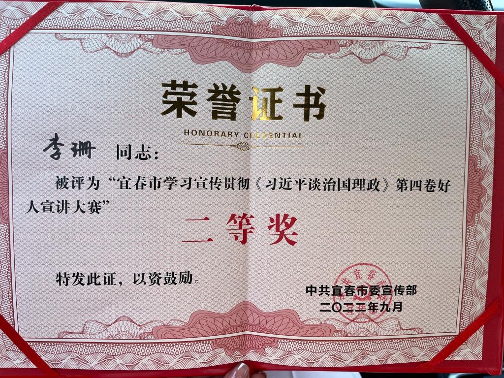 组织开展学习宣传贯彻《习近平谈治国理政》第四卷好人宣讲比赛,选拔推出李珊作为学校代表参加市级比赛。
