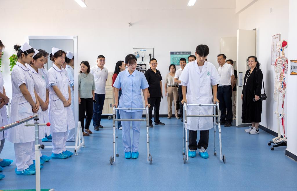 专家组首先参观考察了锂电实训基地,养老实训基地,解剖实训基地,中医、美容、口腔医学实训基地,赣西综合性虚拟仿真实训基地,了解了买球官网“一锂一老一小”三大专业群的实训基地建设情况和虚拟仿真实训基地建设情况。