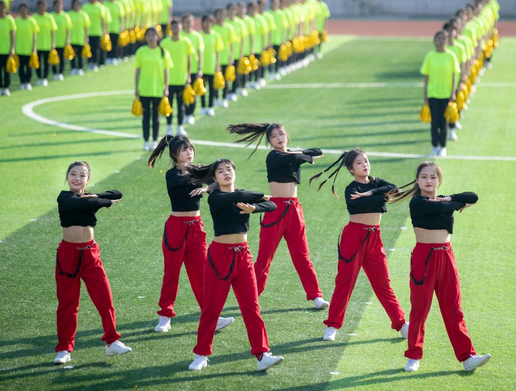 初冬的体育场,全体师生英姿勃发,群情激昂。8时28分,开场舞《万疆》以鲜艳的中国红点燃全场。场地中央,巨幅五星国旗铺展开来,缀有红星的花折伞美丽绽放,向心聚拢,如中华儿女与祖国母亲相依相偎,以凌云壮志,守国之万疆。