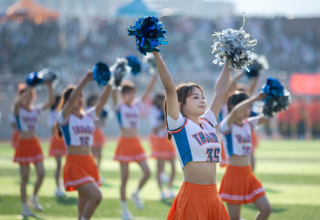 紧随其后的是各学院代表队。护理学院代表队手持红黄两色绸扇翩翩起舞,白衣天使展翼赛场;医学院代表队由身着戎装的退伍军人担当旗手,威武军礼,尽展蓬勃风貌;师范学院代表队手捧鲜花自信走来,如园丁呵护祖国的花朵,“四有好老师”的风范尽显其中;艺术与设计学院代表队着一袭白纱于红绸中飞舞,如同晚霞下的天鹅,轻盈曼妙……各院代表队相继登场,绸扇、翻花、彩带、无人机……造型多样,各具特色。他们脚步坚定,口号铿锵,势以奋斗之姿在本次运动会中彰显青春之貌。
