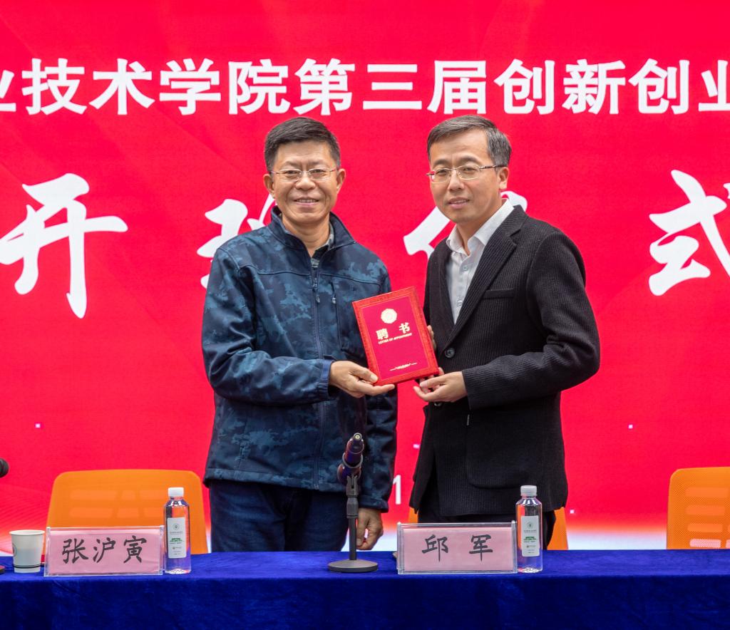 仪式伊始,邱军向特邀的武汉大学博士生导师、二级教授张沪寅颁发创新创业导师聘书。