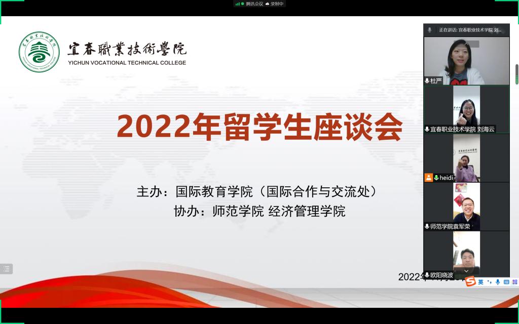 首先,刘海云通过诵读江西高校外籍师生热议二十大的发言引导留学生通过学习党的二十大精神了解中国的历史、中国文化、了解中国促进世界和平与发展的理念等。她对同学们说,江西高校很多外籍师生都表示被江西山水所吸引,相信同学们来到宜春也会被宜春的山水所陶醉,也更能深入理解“绿水青山就是金山银山”的理念。接着,留学生们对现在的教学、班级管理等方面提出了意见与建议,大家一致对现在的教学及班级管理很满意,并期待能尽快返校,和同学们一起进行线下学习,提高学习效率,同时更好地融入班集体;袁军荣、欧阳晓波希望留学生们认真进行网课学习、按时高质量完成老师布置的作业,争取期末考试取得更好的成绩;江萍就留学生返校事宜进行了说明;最后,刘海云表示,期待和同学们在美丽的校园见面,祝福同学们学习不断进步。