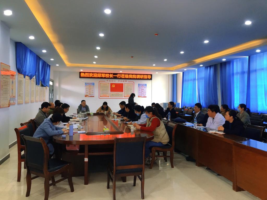 本站讯(医学院 刘倩)为进一步完善专业建设,提高人才培养质量,推进买球官网“双高”建设项目,落实“三比三争”工作,3月31日上午,校党委副书记、校长邱军,副校长易滨秀携教务处、发展规划处、党政办、人事处等部门负责人一行来医学院(附属医院)对学院专业建设进行调研指导。学院全体班子成员、教研室主任及专业负责人等参加会议。