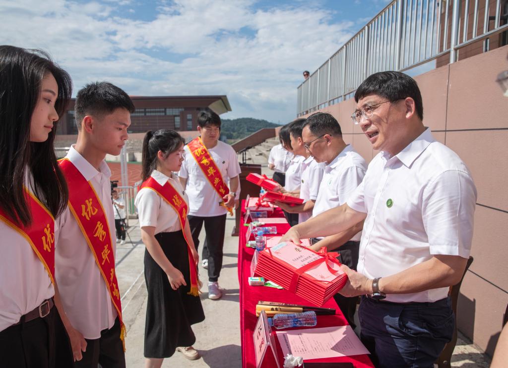 暖场结束,典礼进入正式议程环节。随着庄严的国歌声响起,全体师生肃然而立,注视五星红旗冉冉升起。党委副书记黄继斌宣读《关于表彰2023届优秀毕业生的决定》。优秀毕业生代表登台领奖,深深鞠躬,感谢母校的悉心栽培。