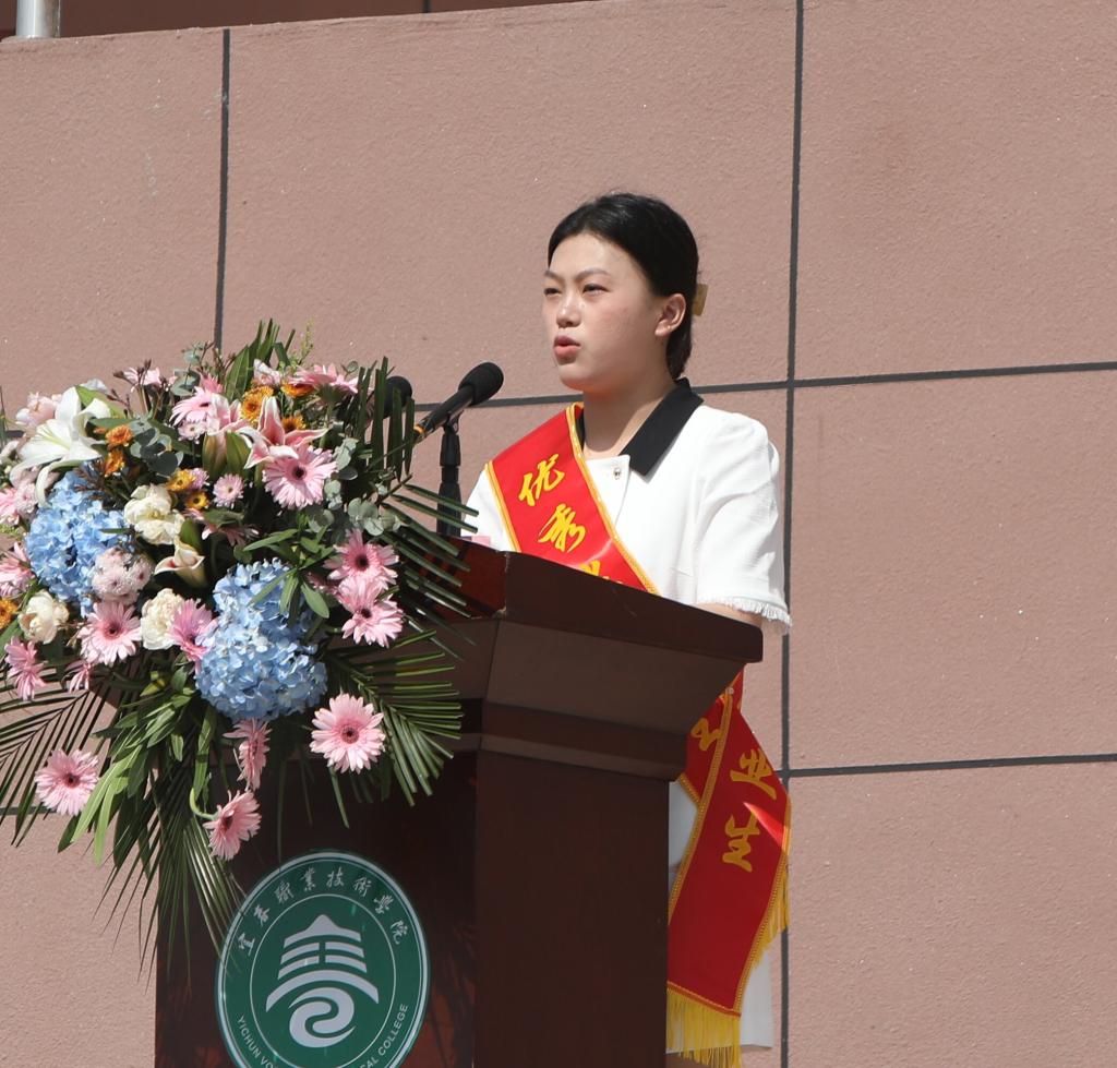 优秀毕业生代表、医学检验技术20301班夏莹发言,她分享了在宜职三年的点滴,表示会带着师长的教导站在新的起点,逐梦四方。毕业生家长代表围绕“感谢”和“希望”发言,感恩孩子的一路成长有学校、老师和同学们的指引陪伴,希望他们在未来道路上能吃苦、肯奋斗,做新时代的追梦人。教师代表熊焕光勉励同学们做一个有本事、有品味、有思想、有担当、有爱的人,在最美的年华,写最好的诗,走最好的路,圆最好的梦。