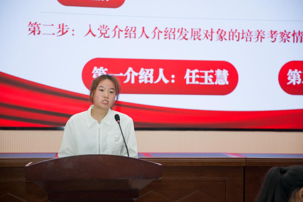 支部大会上,发展对象逐个汇报了自己对党的认识宣读入党志愿书;入党介绍人介绍了发展对象的有关情况,并对其能否入党表明态度;支部书记向支部大会报告对发展对象的政治审查结果;与会党员对发展对象能否入党逐个讨论,发展对象对参会党员讨论情况表明了自己的决心和态度;最后,大会以无记名投票的方式进行表决。支部大会整个过程程序规范、步骤严谨,观摩性强、学习性强。