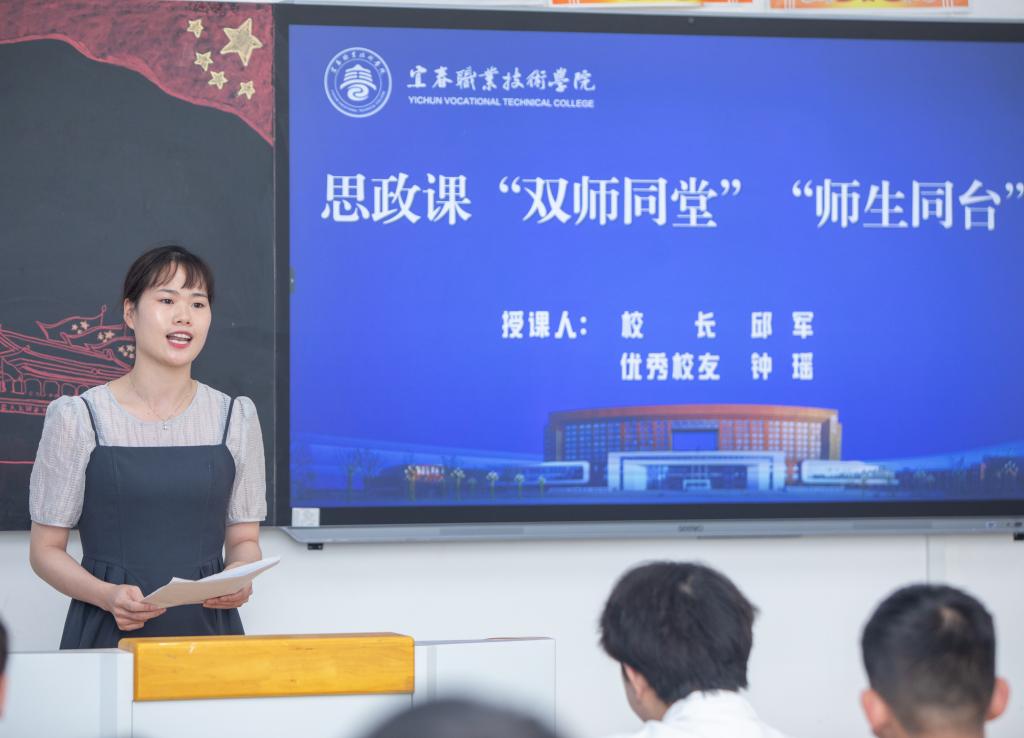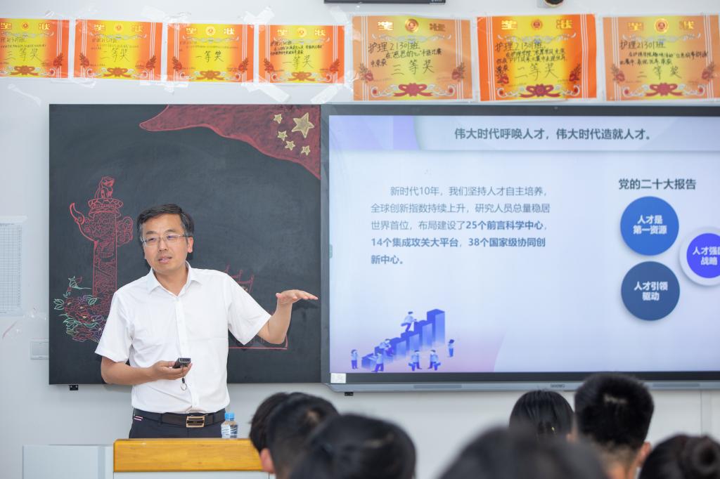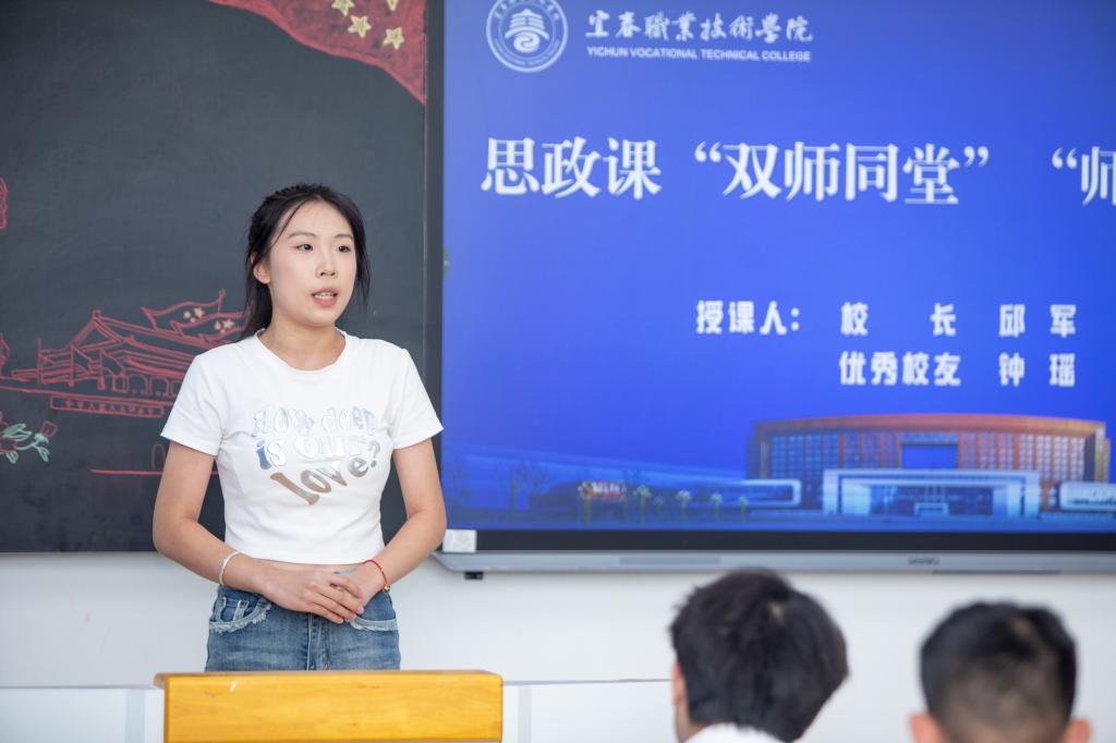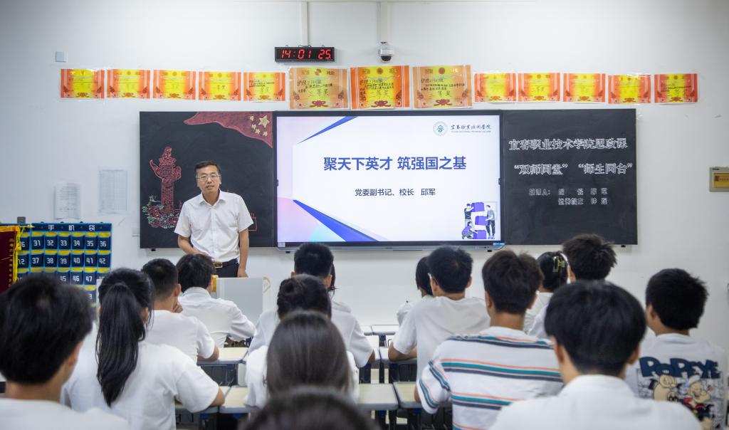 邱军与“全国优秀共青团员”、优秀校友钟瑶为护理22301班学生授课,“双师同堂”共育时代新人。邱军以“聚天下英才,筑强国之基”为主题,围绕人才作为第一资源对我国经济社会建设的重要意义展开讲授,阐释了我国实施人才强国战略的重大意义,讲明了新时代我国各项事业的发展为青年施展才华提供了更加广阔的舞台。他与同学们热情互动,激励青年学子要深化爱国之心、砥砺报国之志,努力成为党之所需、国之所需的栋梁之才,自觉肩负起时代赋予的使命责任。钟瑶结合宜职学习经历、个人奋斗历程、职业成长故事,勉励学弟学妹们努力学习专业知识,练就过硬职业技能,成就“出彩宜职”的那一抹白。