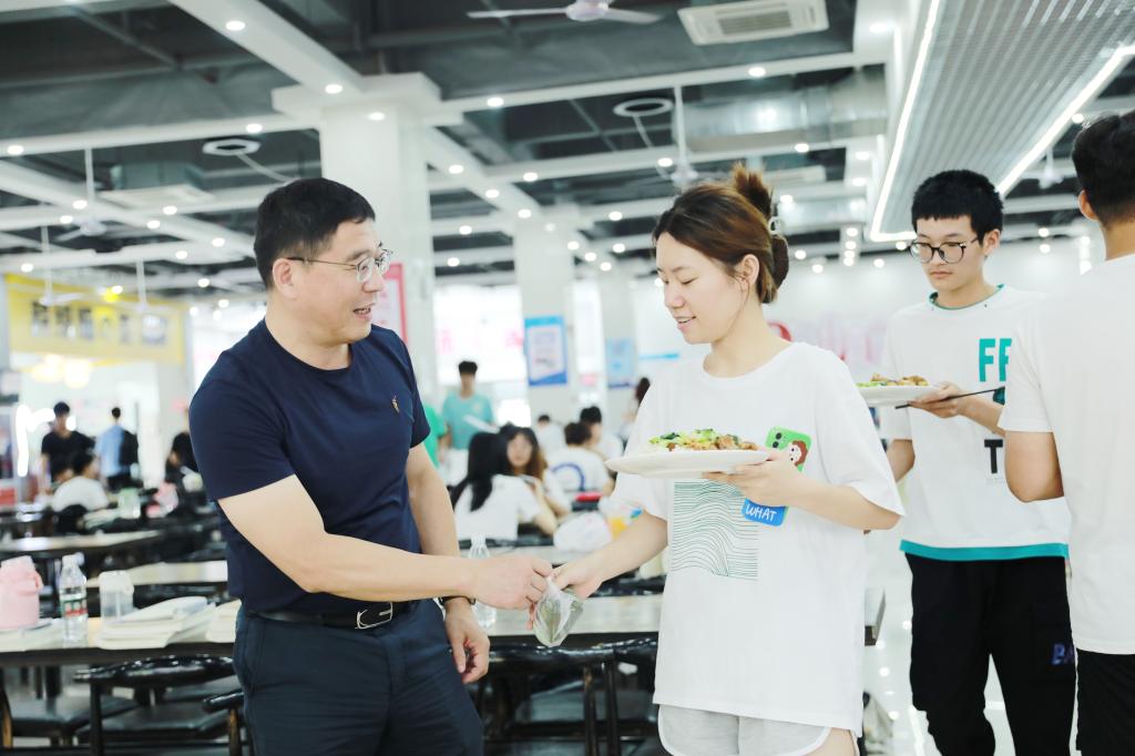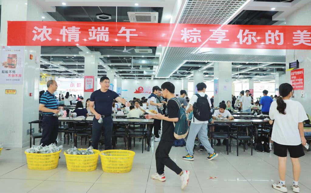 食堂为同学们提供免费丰盛的午餐,任军为同学们送上粽子和咸蛋,现场气氛热烈、其乐融融,同学们笑容满面地领取粽子和咸蛋。