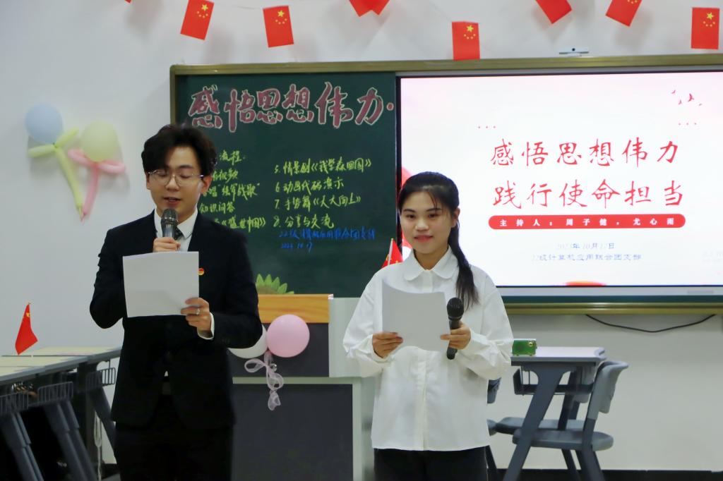 本站讯(团委 甘露 学生记者 刘婷)凝心聚伟力,奋进谱华章。为引导买球官网广大青年学子在强国建设、民族复兴伟业中把稳思想之舵,在深学笃行中凝聚青春力量,10月17日晚,校团委在全校范围内组织开展“感悟思想伟力,践行使命担当”主题团日活动。各班团支部紧扣主题,采用PPT展示、故事分享、诗歌朗诵、歌曲合唱等多样形式开展此次活动。