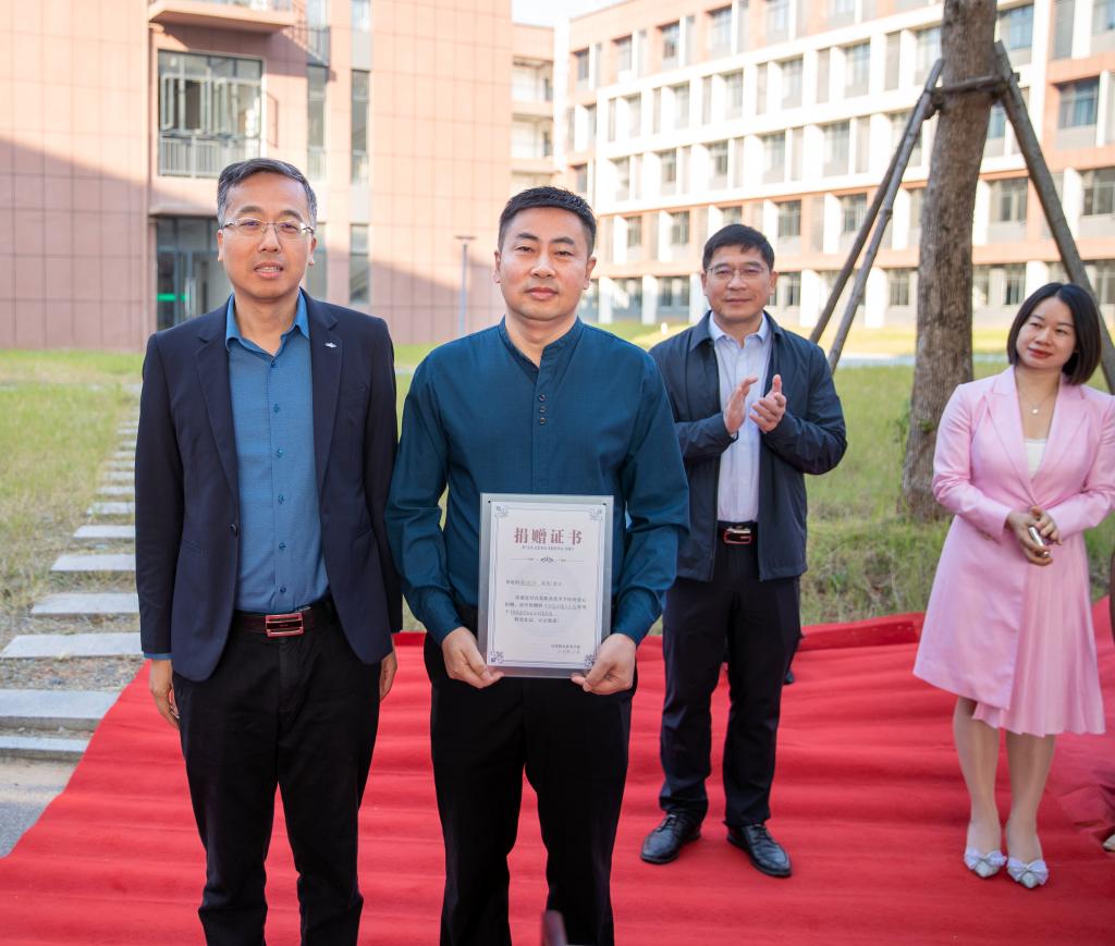 任军、邱军与杨经伟、陈秀英共同为慈航中草药科普生态园揭幕,邱军为杨经伟颁发捐赠证书。