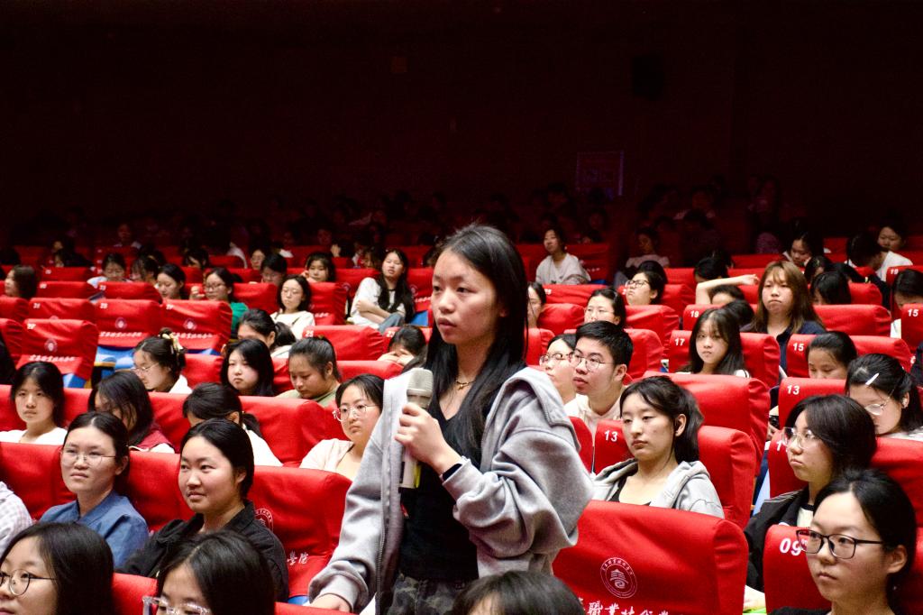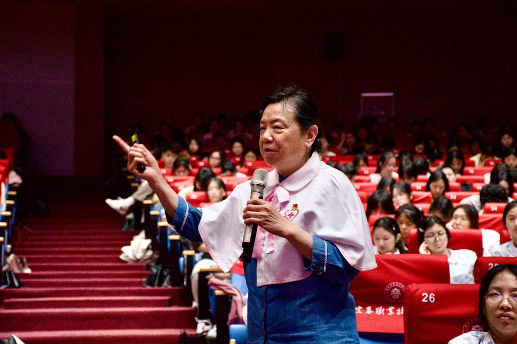 在场师生深受震撼,掌声频频响起,同学们不断举手想要跟邹老师互动。护理学院22308班周雨桐表示:“听完了邹老师的这场讲座,我深刻认识到理想信念对一个人的巨大支撑力,而我们医护人员最不可缺乏就是坚定的理想信念。”讲座最后,口腔医学23301班袁佳妮上台分享了她与邹德凤老师的故事,身为校红十字会会长,她于2024年10月参加中国红十字会第十二次全国代表大会期间,曾向邹德凤老师深入学习红十字会建设与志愿服务队管理经验。