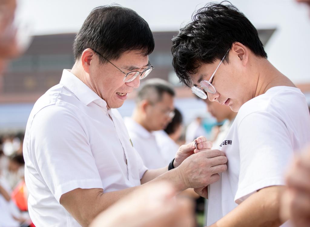 校徽佩戴仪式上,与会校领导郑重地为新生代表佩戴校徽。这枚绿色的“春“字徽章,不仅是“宜职人”身份的象征,更凝聚着学校“发强刚毅、生生不息”的精神,饱含着对6180名新同学的殷殷期许。
