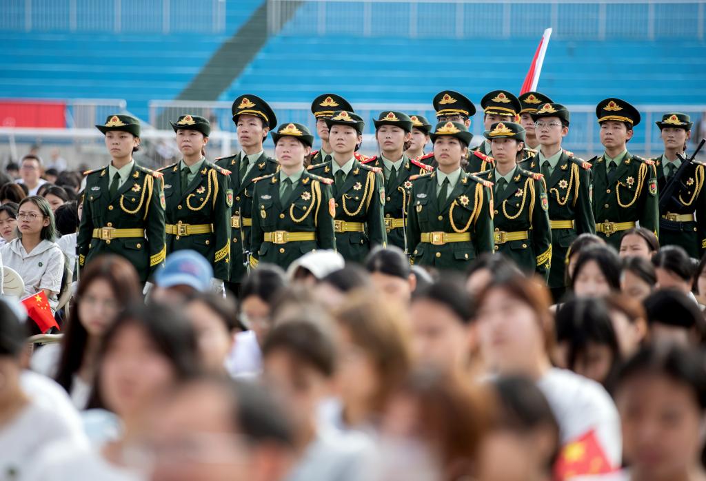 上午9时许,国旗护卫队身着戎装,步履铿锵,护送鲜艳的五星红旗至升旗台。当雄壮的《义勇军进行曲》奏响,五星红旗冉冉升起,全体师生庄严肃立,行注目礼,共唱国歌,典礼正式拉开帷幕。
