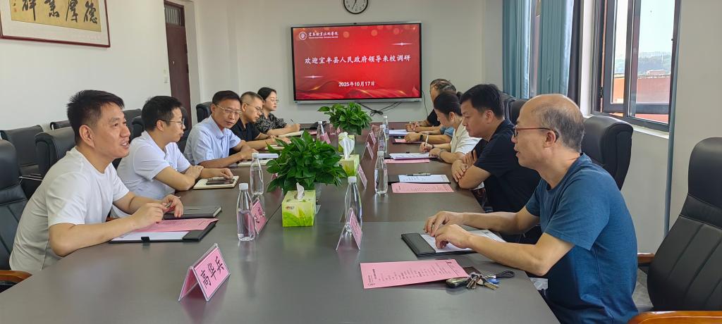 本站讯(社会合作办 彭腾)为贯彻《江西省高职学校县域产业学院建设指南(试行)》精神,推动职教资源下沉与地方服务提升,10 月 17 日上午,宜丰县副县长戴娟娟率县教体局、宜丰中专相关负责人来校调研,围绕县域产业学院建设、校地合作路径座谈。宜春市教体局职成科科长周元平到会指导,校党委副书记、校长李铁刚主持接待,副校长张印华及党政办、社会合作办、师范学院、机电与新能源汽车学院负责人参与交流。