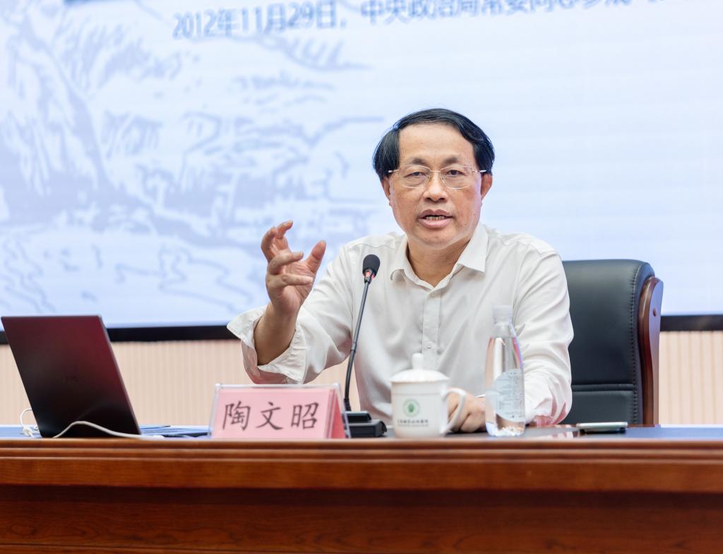 本站讯(党委宣传部 吴霞)9月29日,校党委理论学习中心组召开扩大学习会,专题学习《习近平谈治国理政》(第五卷)。中国人民大学教授、马克思主义学院副院长陶文昭受邀作辅导报告,为大家带来了一场高质量的讲学。党委书记任军等班子成员出席,学校全体中层干部、马克思主义学院教师列席参会,会议由任军主持。