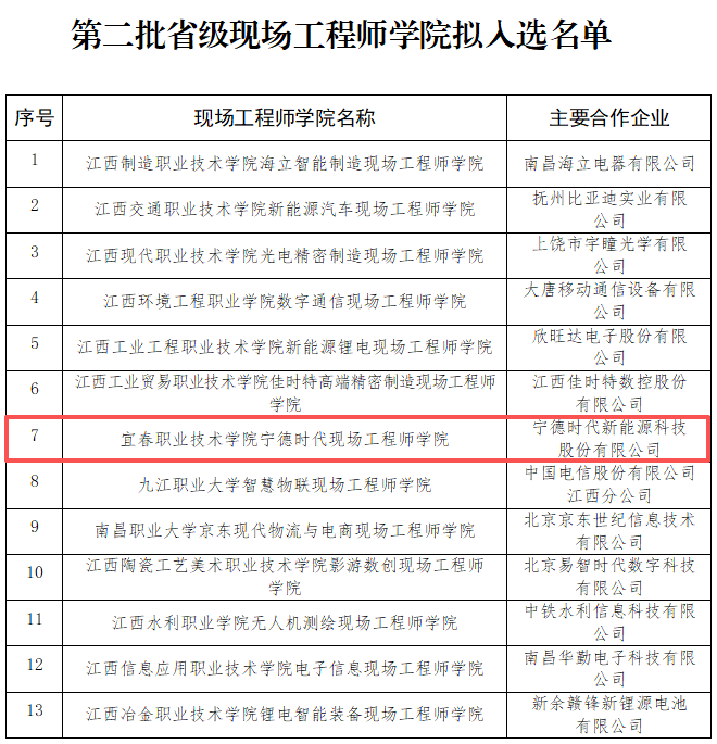 本站讯(社会合作办 彭腾)近日,江西省教育厅联合省工信厅、省国资委、省发展改革委正式发布《关于第二批省级现场工程师学院遴选结果的公示》,买球官网与宁德时代新能源科技股份有限公司深度合作共建的“宁德时代现场工程师学院”,历经书面评审、实地考察、联合会评等多轮严格遴选,成功入选第二批省级现场工程师学院名单。这一重要成果,标志着学校在深化产教融合、创新应用型人才培养模式、服务区域产业高质量发展等方面迈出了关键性步伐,办学特色与育人成效获得省级主管部门的高度认可。