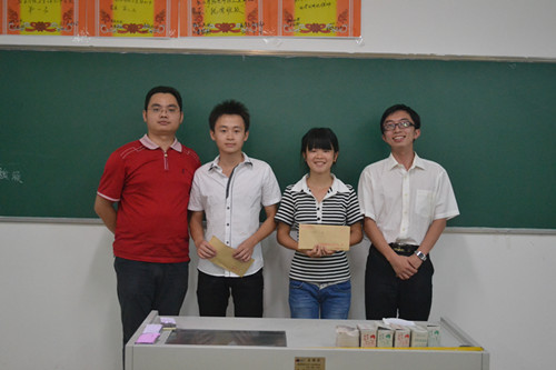 刘敏宣读获奖名单:叶雪琼、任俊华获一等奖学金,每人奖励1000元;陈兴平等六名同学获二等奖学金,每人奖励500元。莫卫平为获奖同学颁发奖学金。