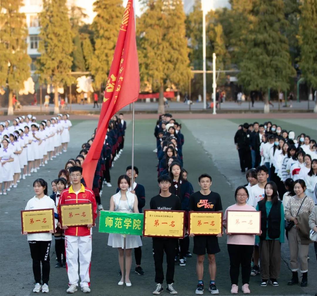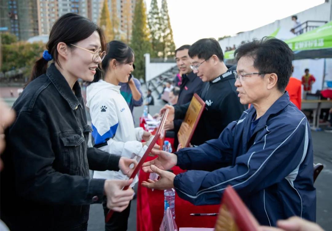 总裁判长徐桑老师宣布本届运动会比赛成绩:师范学院荣获开幕式入场式队列评比第一名、团体总分第一名,荣获体育专业组团体总分第一名的是2020级体教班。刘江毅宣布荣获体育道德风尚奖名单,电商与旅游学院荣获大专组第一名,信息工程学院荣获中专组第一名。校领导为各获奖单位颁奖。