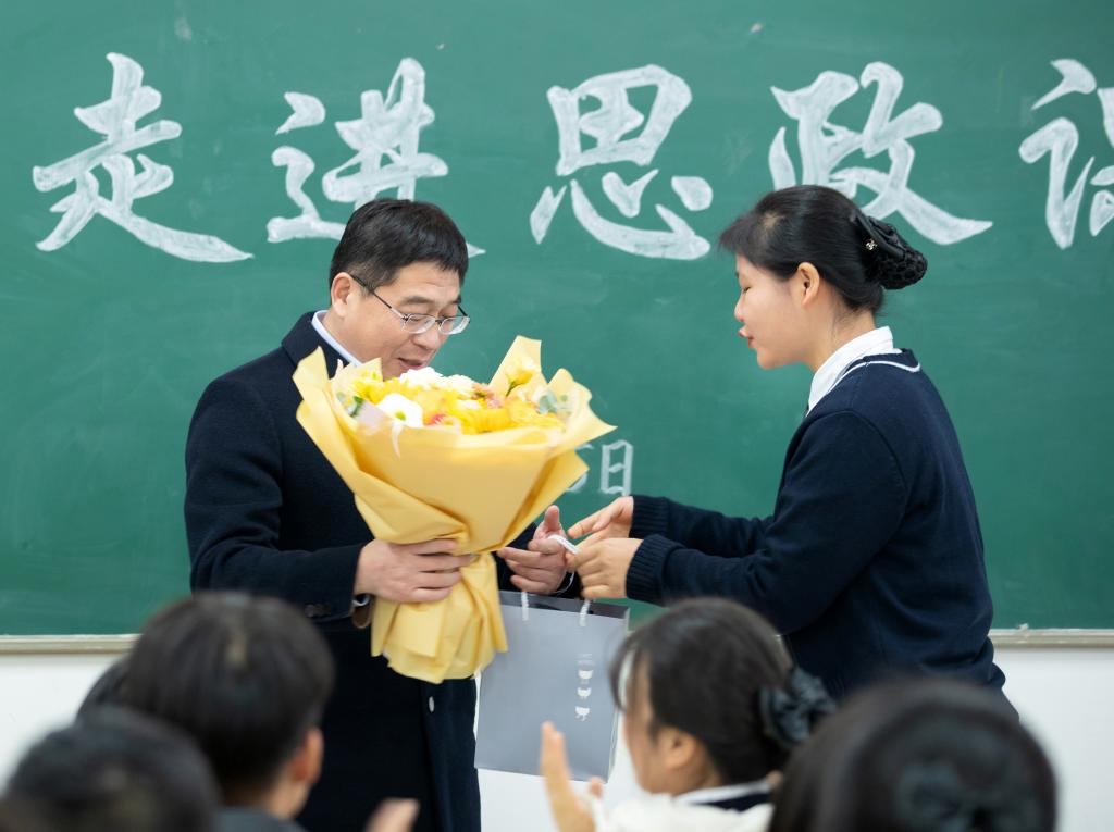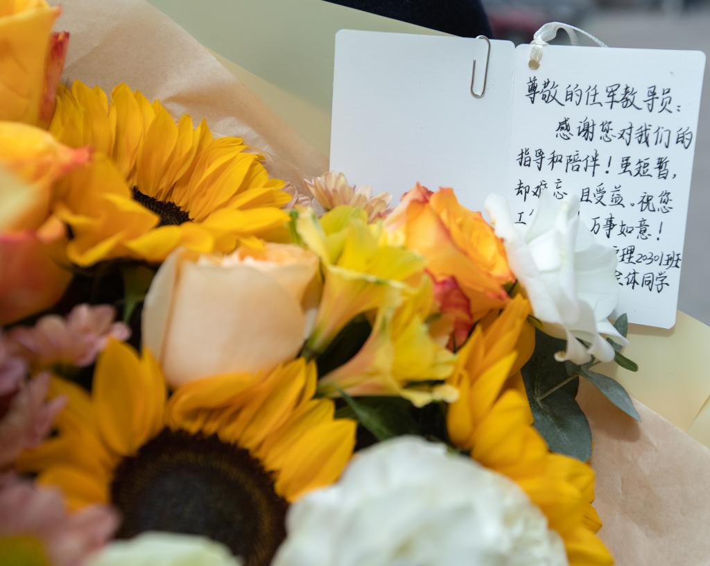 副班长余玲代表班级为任书记送上鲜花和56名同学手写的明信片。同学们将深深地祝福写在卡片上,表达自己对书记深深的尊敬和爱意。