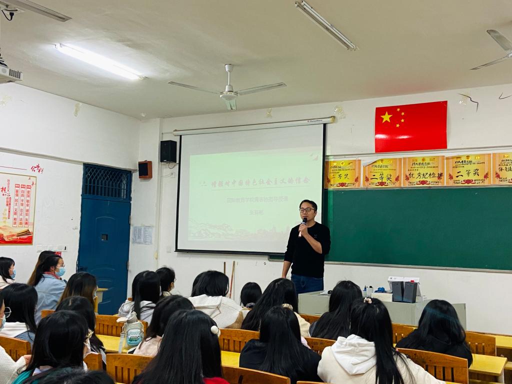 本站讯(国际教育学院 陈娟)为加强大学生对中国特色社会主义的认同教育,使同学们牢固树立中国特色社会主义的理想信念,成为中国特色社会主义事业合格建设者和可靠接班人。国际教育学院青年志愿者协会于3月21日晚在第三教学楼407教室开展以“增强对中国特色社会主义的信念”为主题的授课活动。