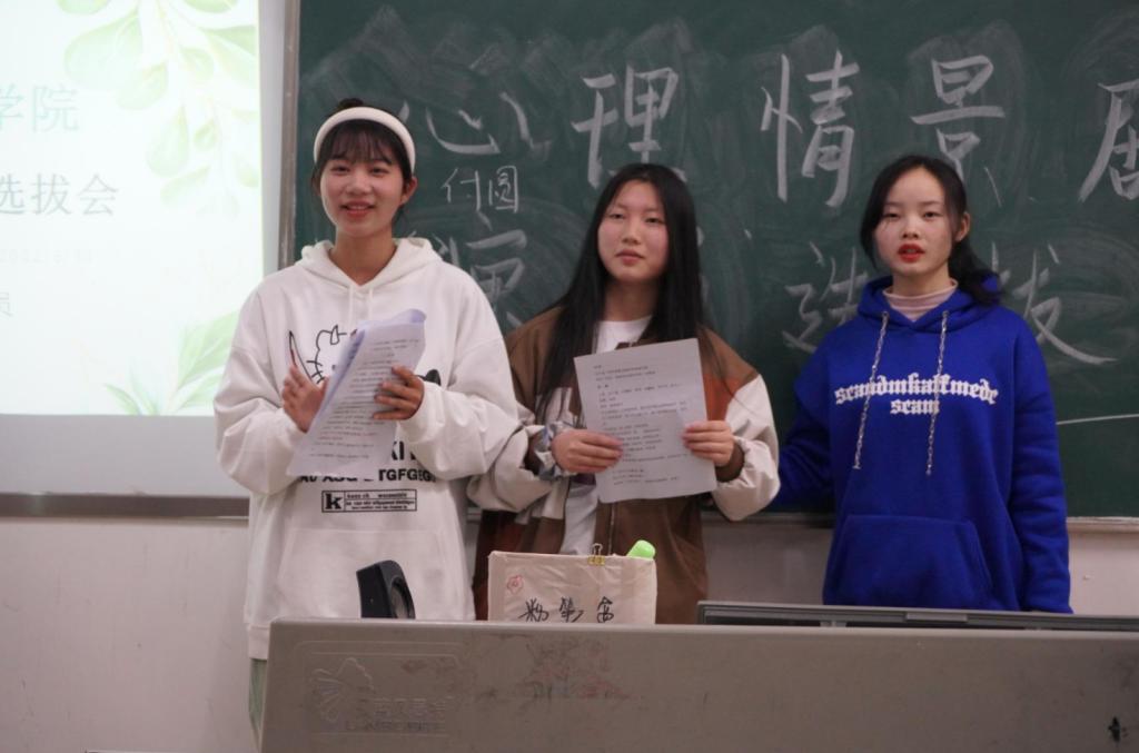 本站讯(电商与旅游学院 马思源 雷邵东)为丰富大学生的校园文化生活,推动525心理健康月的活动,营造积极阳光向上的气氛。2022年3月30日晚七点,电商与旅游学院开展心理情景剧演员选拔活动,选拔活动由辅导员马思源主持,各班级心理委员积极投入到活动前期准备、活动开展等各个环节,21级新生班级踊跃报名参加演员选拔活动。