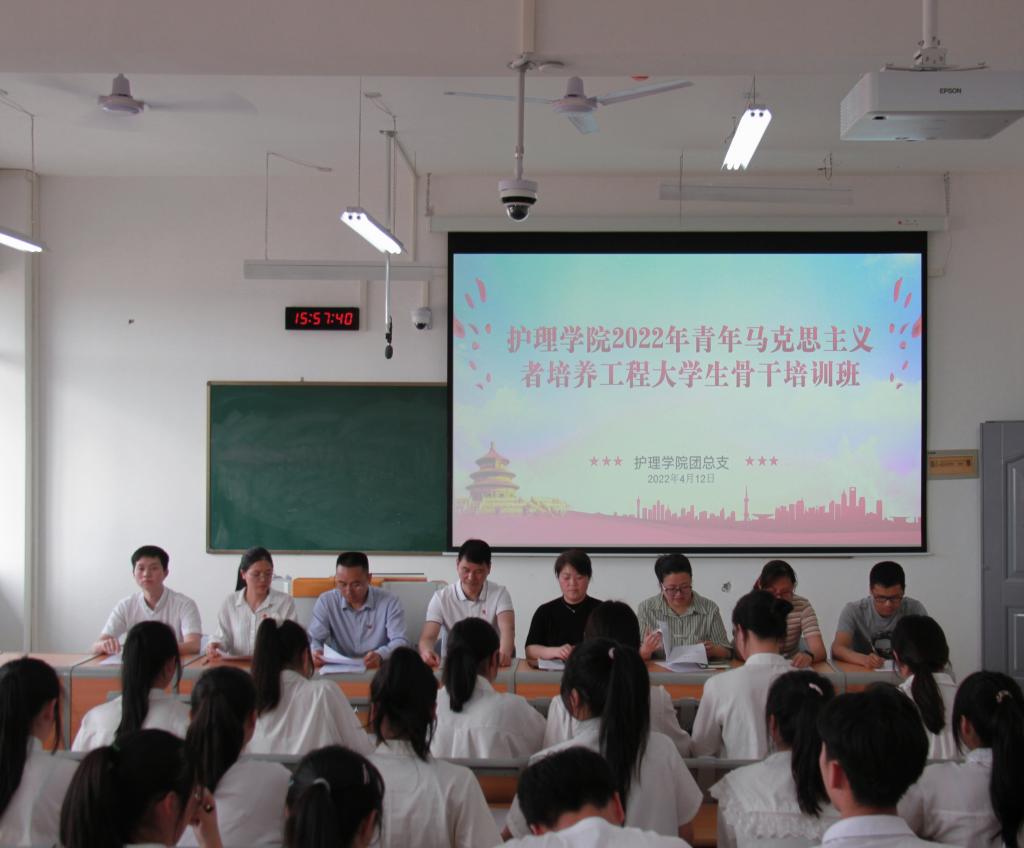 本站讯(护理学院 张蔺珊 欧阳文涛)为深入贯彻习近平新时代中国特色社会主义思想,提高学生干部的理论素养、研究能力和实践水平。4月12日下午,护理学院在和济楼C404教室举行了2022年“青年马克思主义者培养工程”大学生骨干第一阶段集中培训班开班典礼。护理学院院长熊杰平、党总支书记胡蓉、党总支副书记张蔺珊、王玮、学工科科长曲晴、实习就业科科长李辉员、团总支负责人刘小三、辅导员刘明健及全体青马班学员参加了开班典礼。开班典礼由张蔺珊主持。