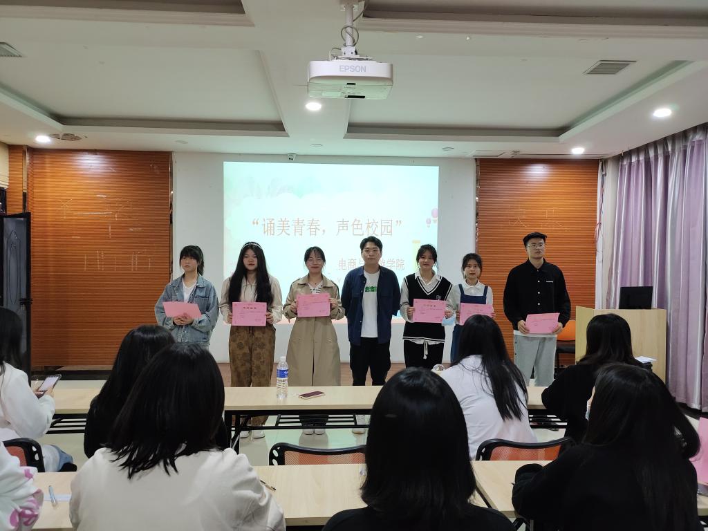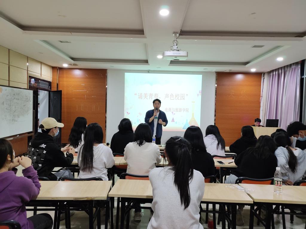 本站讯(电商与旅游学院 马思源 赵文芳)为努力营造浓厚的学习氛围,了解中华优秀文化,电商与旅游学院于2022年4月14日下午7点20分在买球官网电商基地5楼开展“诵美青春声色校园”为主题的朗诵比赛,本次活动特邀辅导员王宁来担任此次评委。