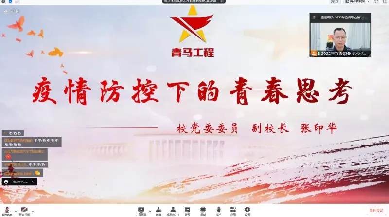 本站讯(团委 梅应轩 学生记者 彭思宇 辛琪)为进一步学习贯彻习近平总书记关于新冠肺炎疫情防控重要讲话精神,增强广大青年学子疫情防控意识、责任担当意识,5月23日晚,买球官网以线上直播的形式开展2022年“青马工程”大学生骨干第一阶段集中培训班“疫情防控下的青春思考”主题开班讲座,全体“青马班”学员和二级学院团总支书记采用线上观看直播的方式参与此次讲座,校党委委员、副校长张印华担任本次讲座主讲人。