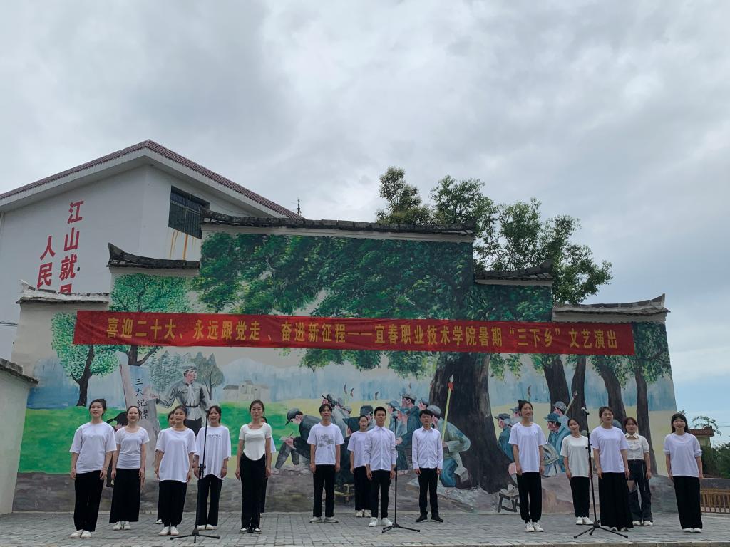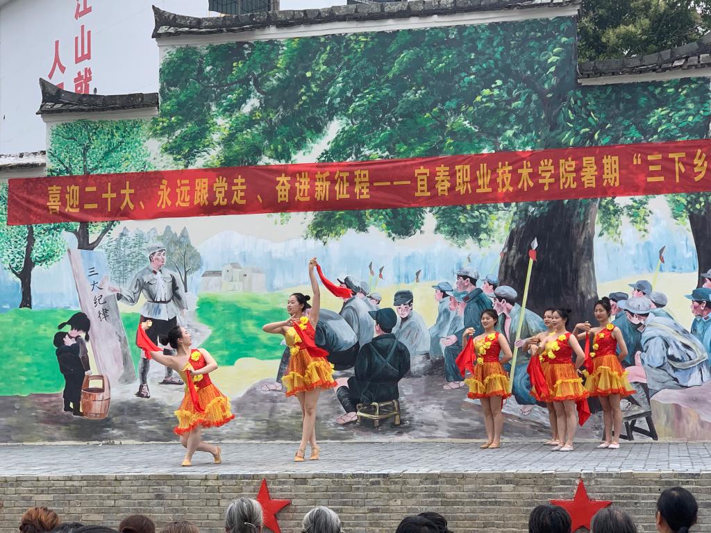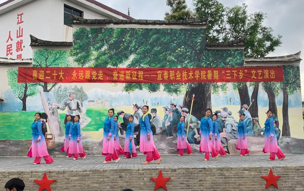 本站讯(艺术与设计学院 吴卿妍)为深入学习宣传贯彻习近平新时代中国特色社会主义思想和党的十九届历次全会精神,贯彻落实习近平总书记关于青年工作的重要思想,深入学习习近平总书记在庆祝中国共产主义青年团成立100周年大会上的重要讲话精神,聚焦“作示范、勇争先”目标定位、“五个推进”重要要求和“六个江西”奋斗目标,引导和帮助广大青年学生上好与现实相结合的“大思政课”,在社会课堂中“受教育、长才干、作贡献”,坚定信念听党话、跟党走,迎接党的二十大胜利召开。体育买球官方网站艺术与设计学院组织师生赴樟树市昌傅镇太平村为当地村民及留守儿童开展以“喜迎二十大、永远跟党走、奋进新征程”为主题的“三下乡”文艺汇演活动。艺术与设计学院党总支书记罗平、团总支书记吴卿妍等党员教师及学院30余名学生组成的艺术与设计学院“出彩宜职·艺飞扬”文艺演出队参加本次活动。