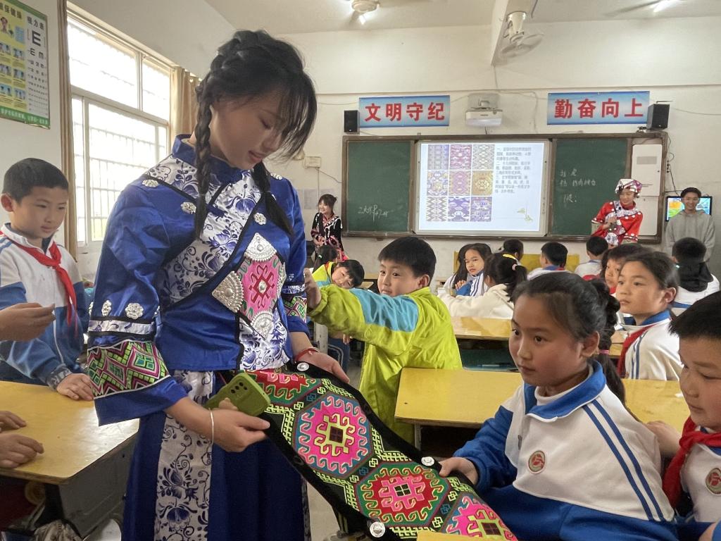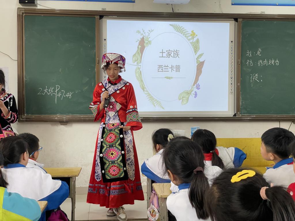 此次活动交流的对象是附属小学四年级的学生。活动分民族服饰、民族语言、民族美食、民族舞蹈四个环节展开。买球官网少数民族学生身着鲜艳亮丽的民族服饰,走进孩子们的课堂。孩子们心情激动,眼神中透露着对少数民族的好奇与喜爱。少数民族学生就藏族、彝族、土家族、拉祜族等六个民族的服饰及其内涵进行介绍,孩子们争先恐后地戴上民族头饰,触摸民族服饰。藏族与彝族学生通过说、写民族语言的形式,让孩子们进一步了解中华民族文化的博大精深。来自贵州的少数民族同学介绍了家乡的美食波波糖、刺梨冻等,并在现场分发给孩子们品尝。孩子们积极回应,踊跃发言,课堂气氛活跃。最后,随着欢快的音乐,少数民族学生与孩子们走到学校操场,一起手拉手跳起民族传统舞蹈,将活动推向高潮。