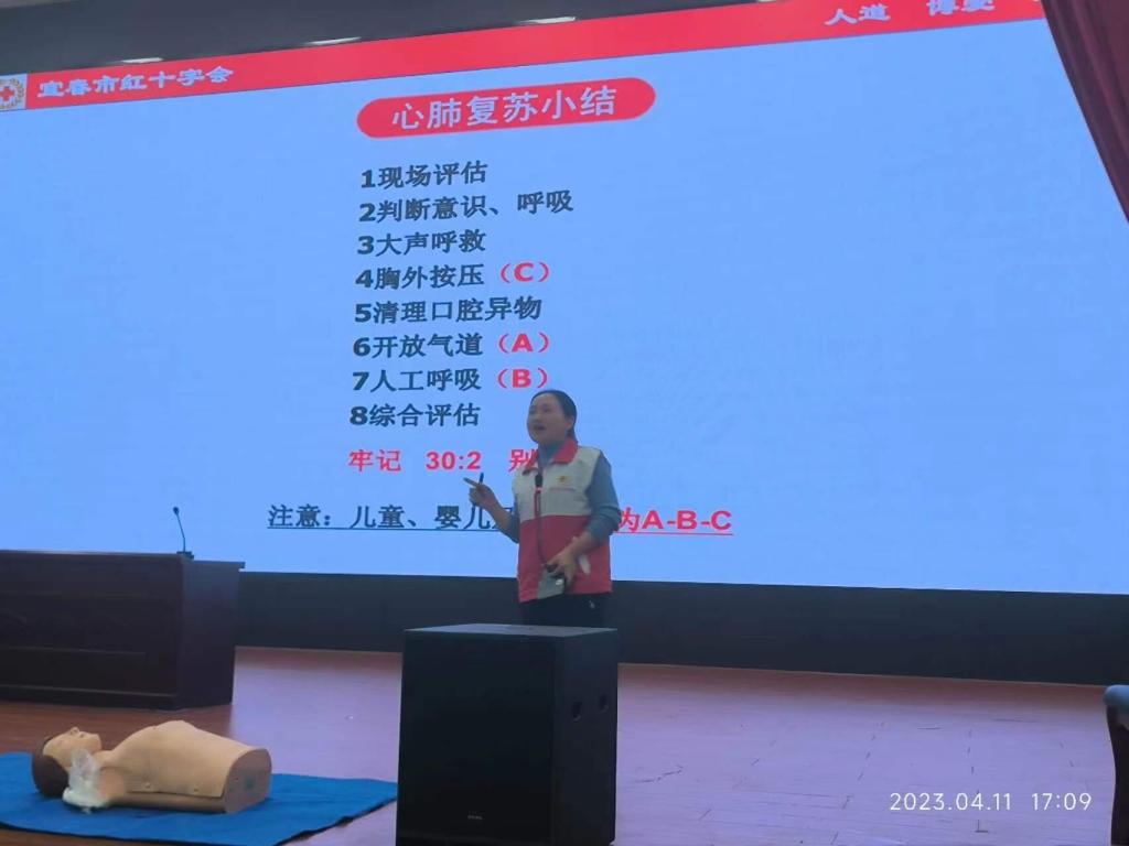 活动伊始,丁雯凤向参会学员介绍救护培训工作开展的意义及普及情况。刘叶建进行动员讲话,指出救护培训工作在学校开展的重要性,并对参加培训的学生寄予殷切希望。最后,王艳为大家开展应急救护培训知识讲座,为学员讲述并演练心肺复苏、AED、气道异物梗阻等急救操作,学员积极参与,反响热烈。