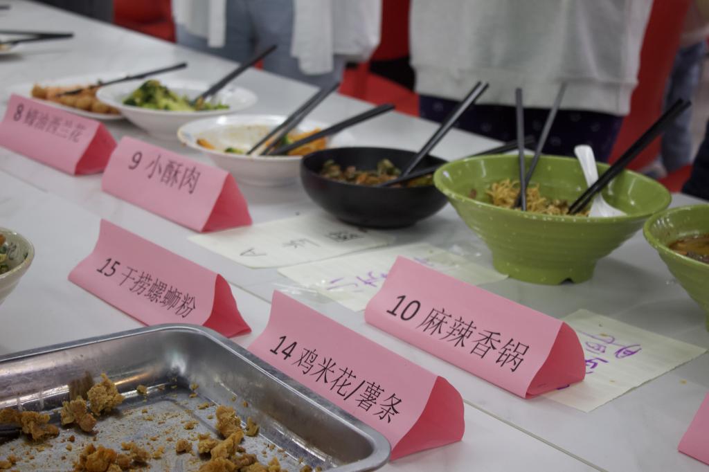 鲜果提拉米苏、香辣肉片、香酥鸭、香辣烤鱼……活动现场摆放了数十道色香味俱全的丰富菜品。“美食试吃”的新颖主题使得路过的同学纷纷加入到试吃队伍当中。试吃结束后,大家都为自己心中的美食投上宝贵的一票。最终,提拉米苏、香辣烤鱼、鸡公煲、鸡米花等九道菜品被授予“最佳美食”称号。
