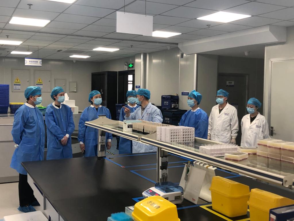全体教师在伍成雄的陪同下参观了南昌艾迪康医学检验中心的实验室。伍成雄带领来访教师们依次参观了标本管理室、临检实验室、自身免疫实验室、档案实验室、基因扩增实验室、流程细胞室、微生物实验室等实验操作间,耐心细致地介绍了各个专业组的操作仪器、检测项目和工作环境。他指出:“我们检测中心最关注的就是质量问题。我们采取信息化、流程化和规范化的管理,从接收标本开始,每一个环节都有跟踪系统进行全程控制,做好监测。”医学院来访教师也抓住学习机会,频频发问,积极拓展交流。