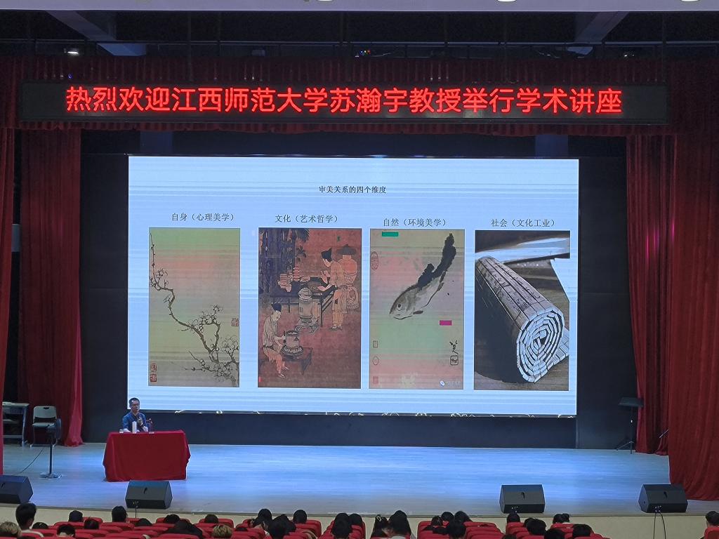 讲座上,苏翰宇以名人名画为讲解素材,从中讲授了绘画所用的材料,绘画的种类、形式。绘画不仅种类形式多样,也是由各国家与民族在社会政治和文化传统的方面的差异,世界各地的绘画表现形式也丰富多样。他最后讲述了美学的本质,美的范畴,美的起源,对美学阐述了自己独到的见解使同学们对美学有了清晰和更加深刻的理解。