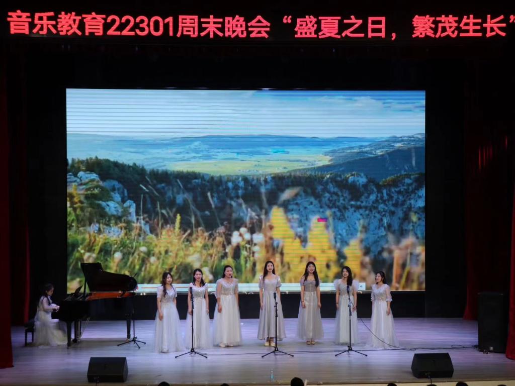 本站讯(艺术与设计学院 吴卿妍)为丰富校园文化活动,展现同学们积极向上的精神面貌,同时结合艺术与设计学院“周周有活动,班班有特色”的学院氛围,提升同学们的审美水平和人文素养,6月2日晚,艺术与设计学院在博达楼“艺飞扬”剧场举行了以“盛夏之日,繁茂生长”为主题的音乐晚会。本次晚会由音乐教育22301班承办。