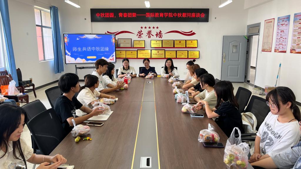 本站讯(国际教育学院 彭娟 学生记者 黄琴 易梦娇 )为丰富同学们的文化生活,营造浓厚的中秋氛围,进一步弘扬中华民族的优良传统,国际教育学院于9月27日在博达楼B502举行中秋座谈会。学院党总支书记刘海云、院长王玮、学团负责老师刘嘉妮、辅导员彭娟和各班同学代表参加活动。