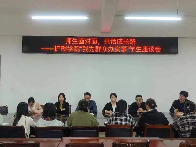 本站讯(护理学院 赖梦婷 谢雨欣)为深入学习贯彻习近平新时代中国特色社会主义思想,着力推进全员全程全方位育人,11月6日,护理学院在和济楼C218开展“我为群众办实事”师生座谈会,班子成员与各年级学生代表面对面交流。