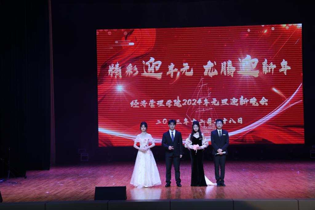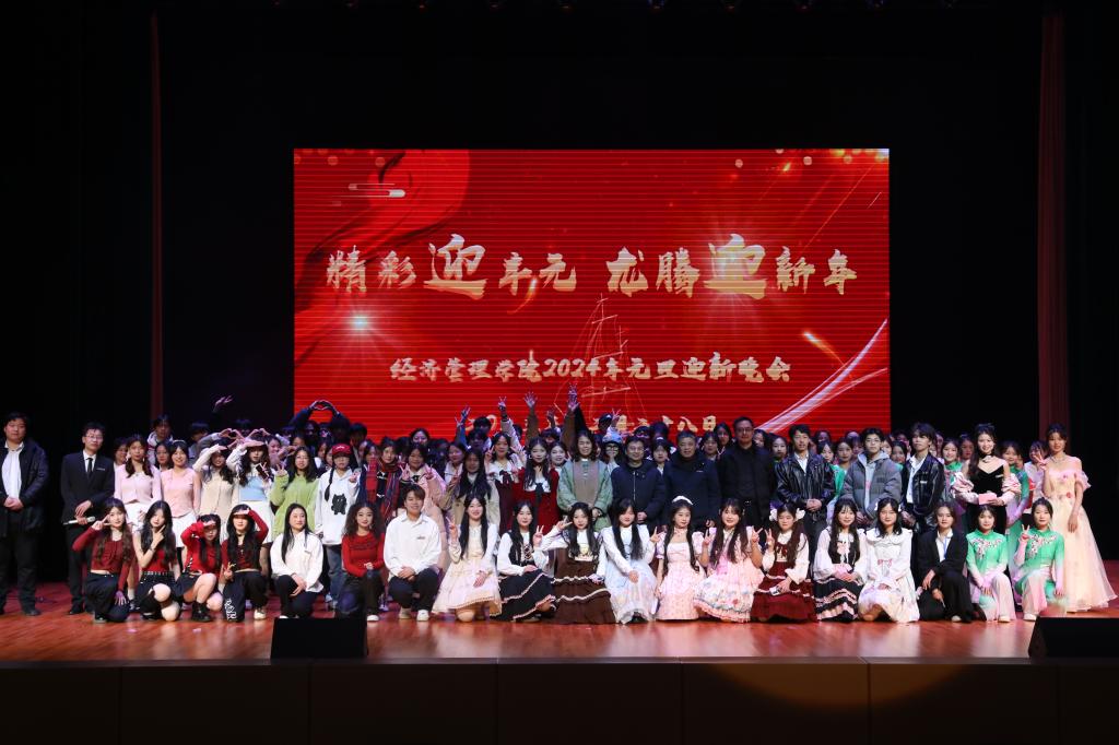 本站讯(经济管理学院 虞婕)卯兔辞旧岁,辰龙迎新年。满怀收获的2023即将过去,2024全新开启,12月28日晚,经管学院2024年元旦迎新晚会在出彩大会堂举行。校党委委员、组织部部长韩海荣,经管学院党总支书记邓晶、院长邓如星、副院长欧阳晓波,几何体电商产业学院文玉泽院长出席晚会,全体师生齐聚一堂,共同欣赏精彩演出。