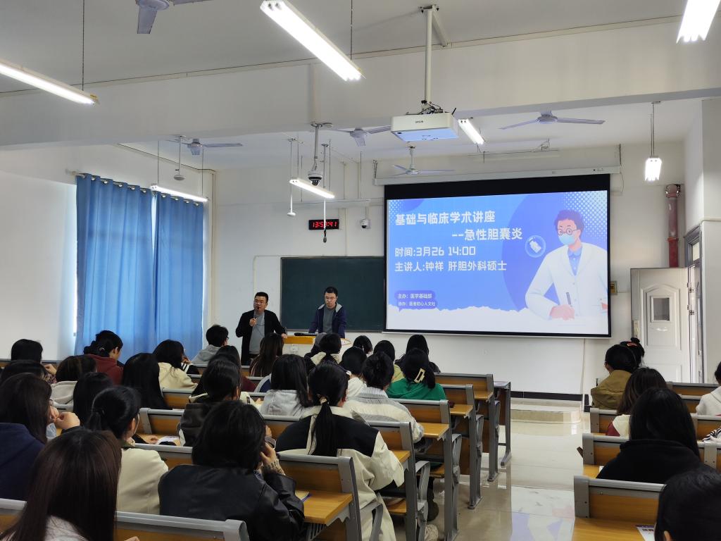 本站讯(医学基础部 尹史帝)为进一步培养学生运用知识分析、解决临床问题的能力,培育学生的临床思维和医者情怀,推进医学基础部党支部“初心引领,出彩共育”品牌建设,3月26日,由医学基础部主办、医者初心人文社协办的“基础与临床专题讲座——胆囊炎”在和济楼C520教室举行。本次讲座由钟祥老师主讲,医学基础部党支部教师和医学院、护理学院在校学生约110人参加,讲座由医学形态教研室主任尹史帝主持。
