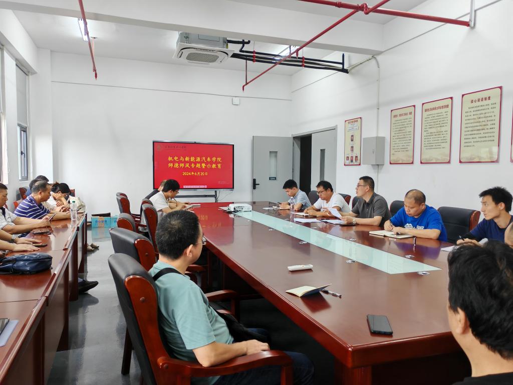 本站讯(机电与新能源汽车学院 何仪)为进一步强化师德师风建设,提升学院教师综合素质,6月20日下午,机电与新能源汽车学院在新能源技术工程中心508开展师德师风专题警示教育会议,会议由院长吴东平主持,学院全体教师参加。