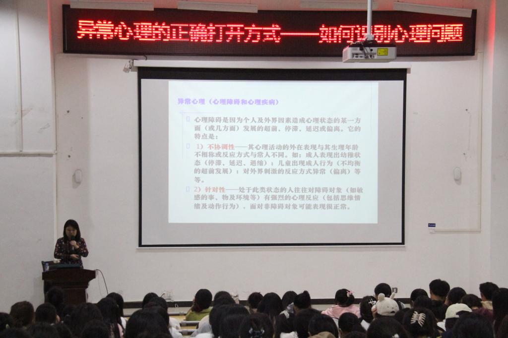 本次讲座中,熊梨花以严重心理问题、可疑神经症、常见的人格障碍的识别作为主线,结合时下的真实病例,详细分析了常见心理疾病的临床表现和症状,深入浅出地传授辨识心理问题的方法,引导学生了解什么是心理异常,心理异常表现,教会学生发现心理异常应该如何处理,并和同学们分享一些心理健康问题预防和调整自我心态的小知识,让在座的同学们对心理问题有了一个全面的认识。